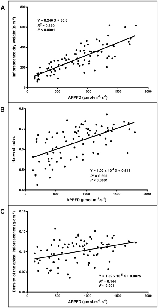 Fig. 1: Relación entre el peso seco de la inflorescencia (A), el índice de cosecha (peso seco total de la inflorescencia / peso seco total sobre el suelo) (B) y la densidad de la inflorescencia apical (basada en el peso fresco) (C) de Cannabis sativa ‘Stillwater’ cuando se aplica la densidad media del flujo de fotones fotosintéticos apicales (APPFD) durante la fase de floración (81 días). Cada dato representa una planta individual.