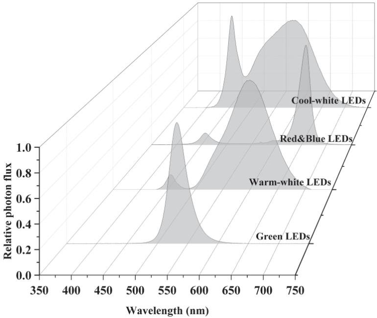 FIGURA 3. Diferentes espectros de luz LED. Los datos se recogieron utilizando un espectrorradiómetro (PS-300, Apogee, UT).