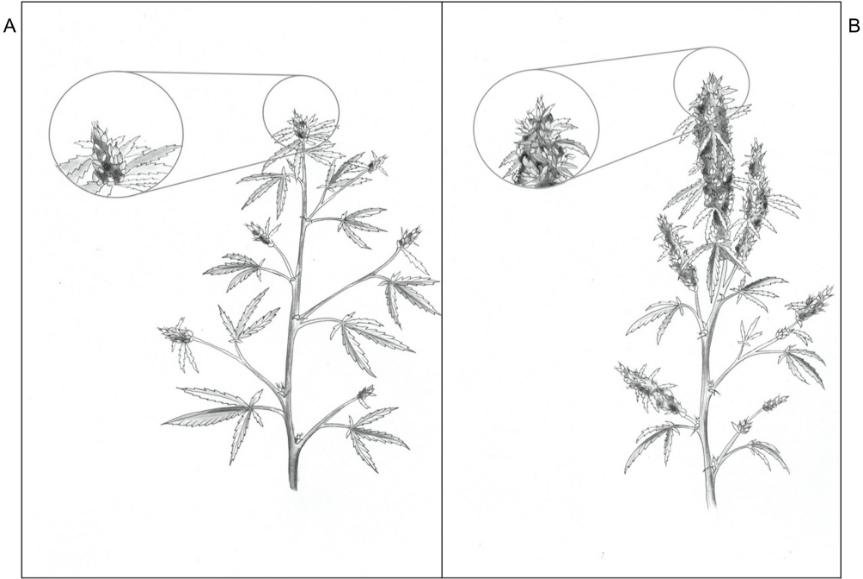 Figura 4 Bocetos de plantas de Cannabis sativa ‘Stillwater’ cultivadas con densidad de flujo de fotones fotosintéticos (APPFD) baja (A) y alta (B), 9 semanas después del inicio del fotoperíodo de 12 h (ilustrado por Victoria Rodríguez Morrison).